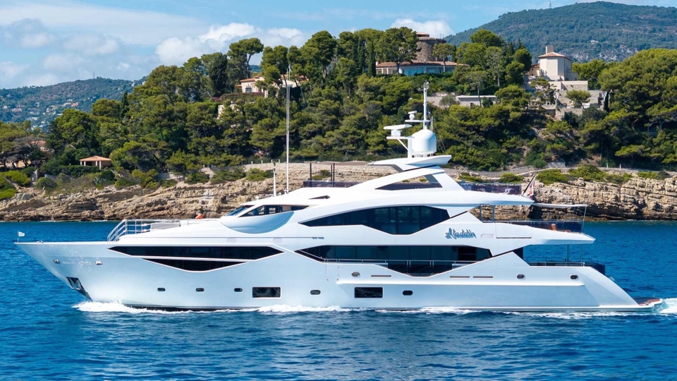 The 40.05m/131’5″ motor yacht ‘Aladdin’ was built by Sunseeker in the United Kingdom at their Poole, Dorset shipyard. Her interior is styled by British design house Sunseeker and she was delivered to her owner in July 2017. This luxury vessel’s exterior design is the work of Sunseeker.